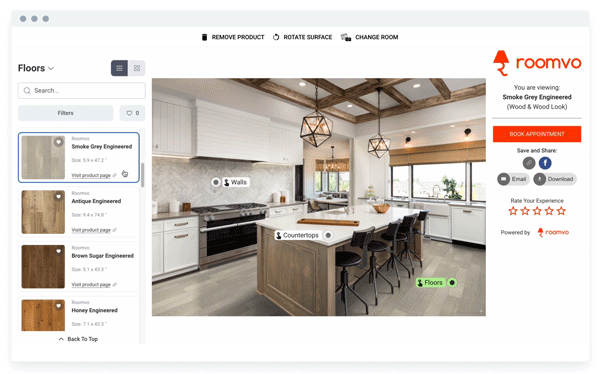 Room visualization gets customers excited about your products, showing how different flooring, rugs, countertops, paint and more would look in their homes before they actually purchase.